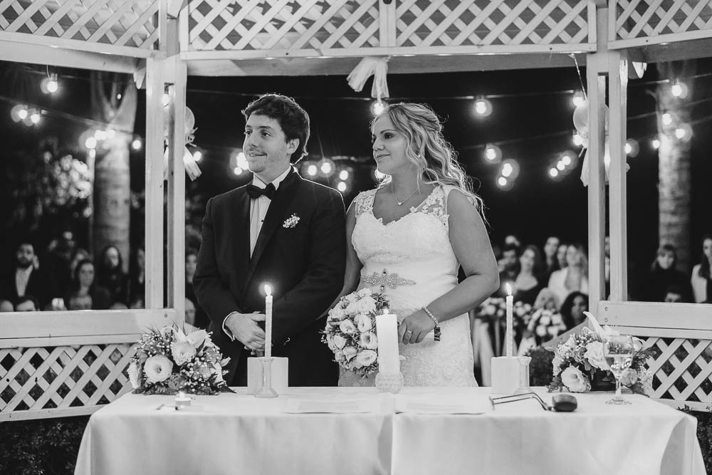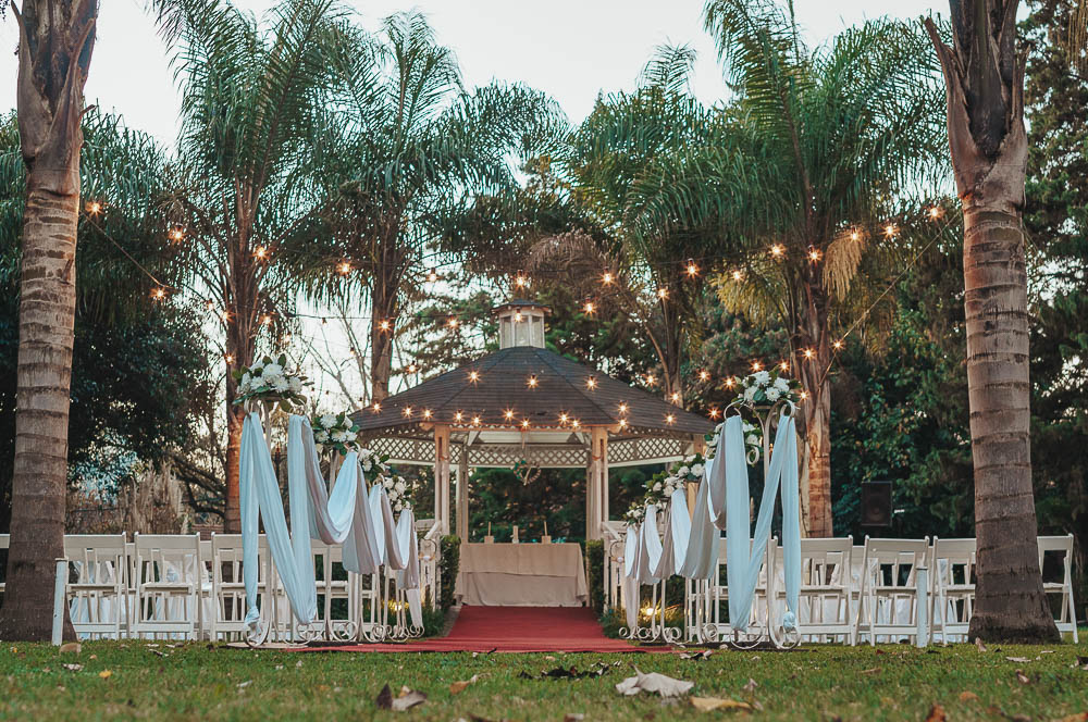 Si optan por realizar la ceremonia al aire libre, pero de noche bajo las estrellas, será muy importante la iluminación artificial del lugar. No solo las lámparas que iluminen el altar y a los novios son importantes, también el resto de la iluminación para los invitados y que toda la decoración se luzca. Es muy recomendable que no tengan luces fuertes de frente a ustedes, para evitar que les moleste a los ojos, lo ideal son luces potentes de ambos costados y que la luz sea lo más natural posible, blanco neutral preferentemente o de lo contrario más cercano al blanco cálido (evitar blancos azulados). También es recomendable evitar luces de colores para iluminar, a excepción que se usen como complemento, para generar distintos climas. Cuanto más natural el ambiente, mejor!
