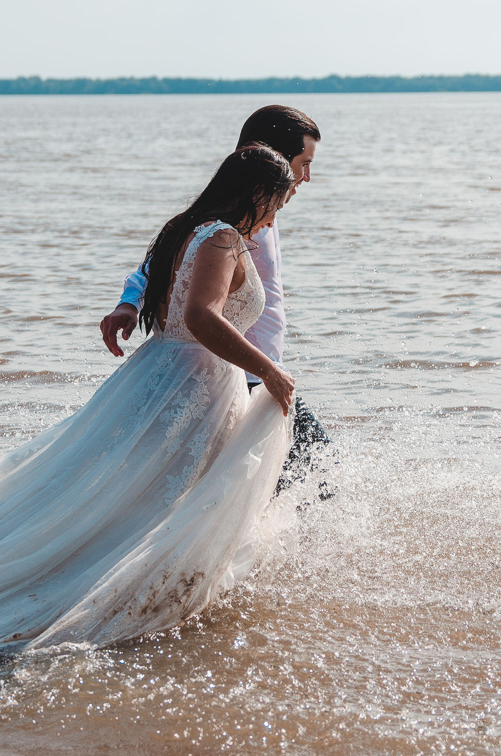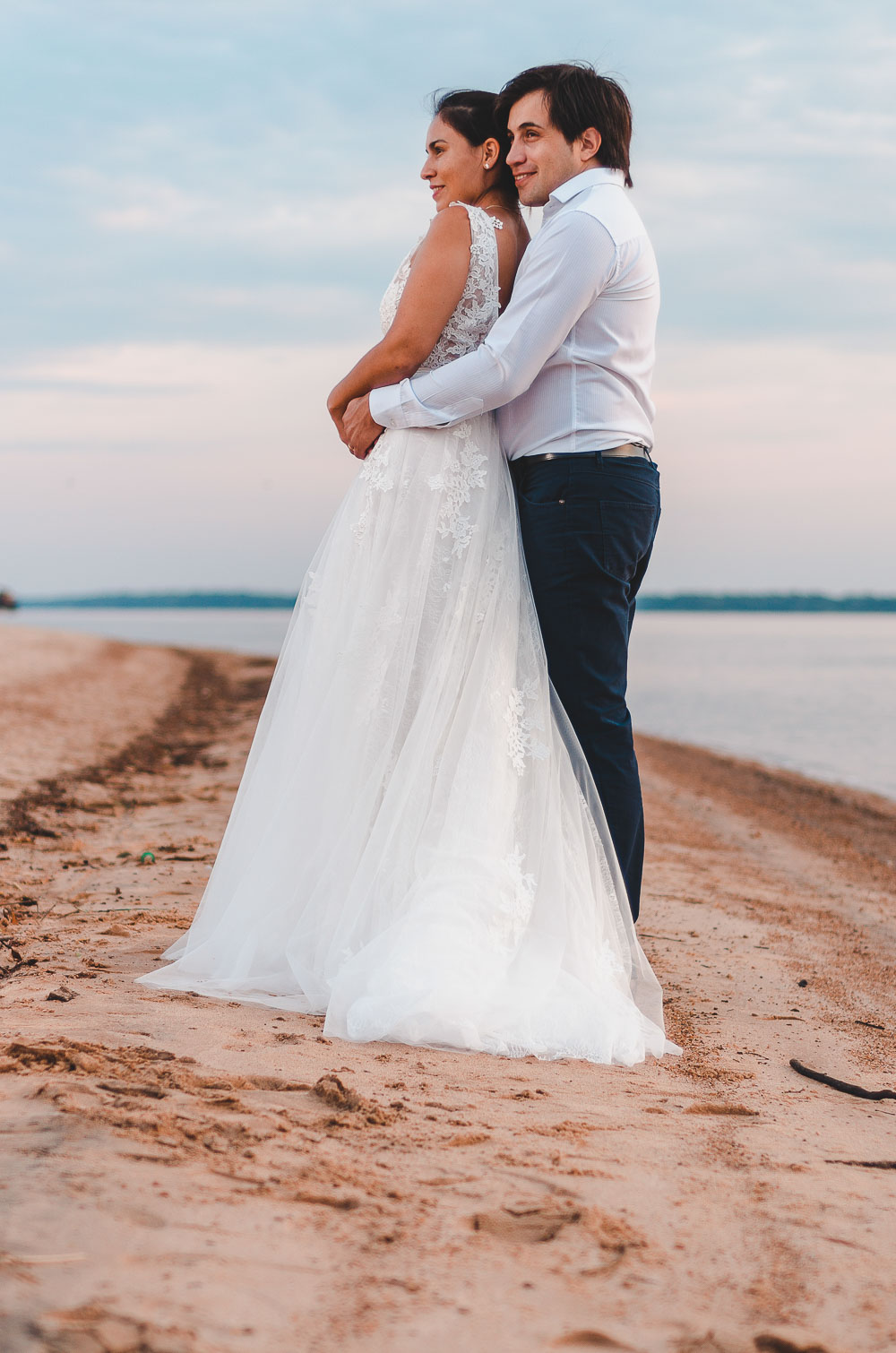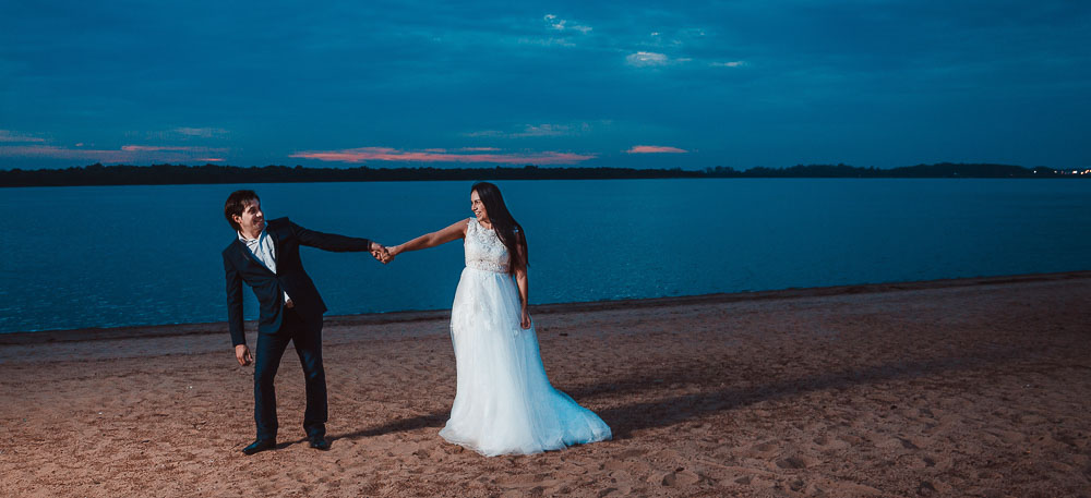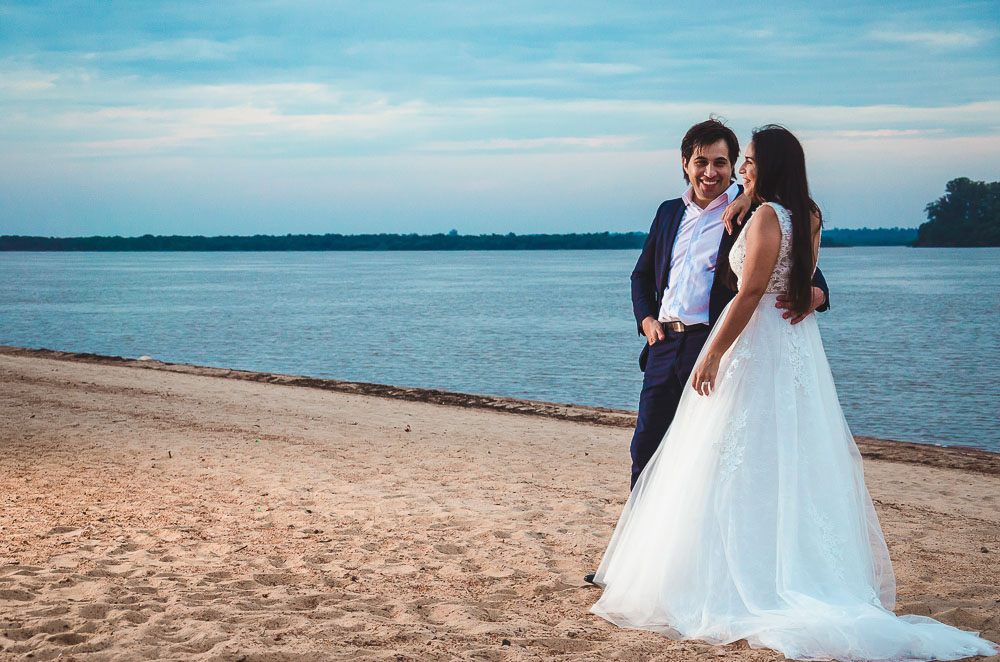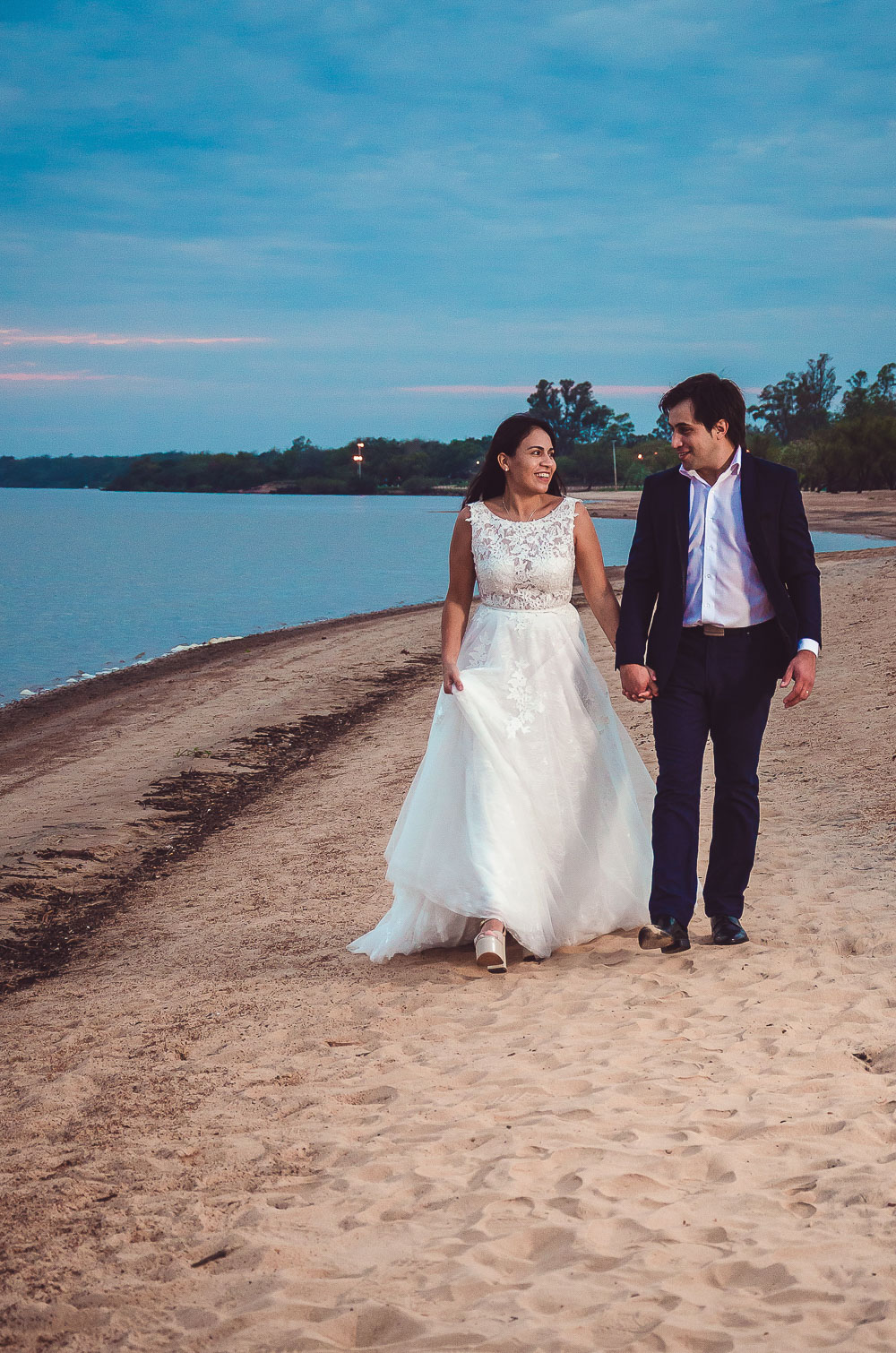 La sesión Pre-boda, el civil, los preparativos, la ceremonia y la fiesta, habían quedado atrás. Victoria y Marcos tenían todo planeado al mínimo detalle, tal cual lo habían soñado. Y la sesión post-boda no sería una sesión de gala nada más, sería una sesión Trash the dress. Cuando el clima parecía no acompañarnos, el amanecer nos encontró en Colón, Entre Ríos, despejando las nubes en el cielo y regalándonos un día de verano en pleno otoño. El Río Uruguay chocaba con la arena, mientras Vicky y Marcos se tiraron de lleno al agua. Las horas pasaron y el atardecer nos sorprendió en el Parque Nacional El Palmar.