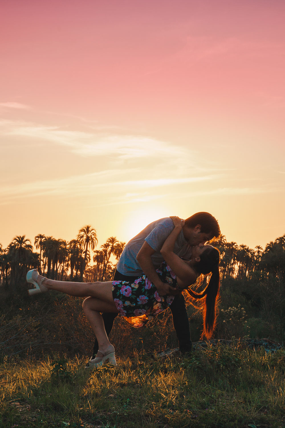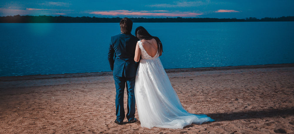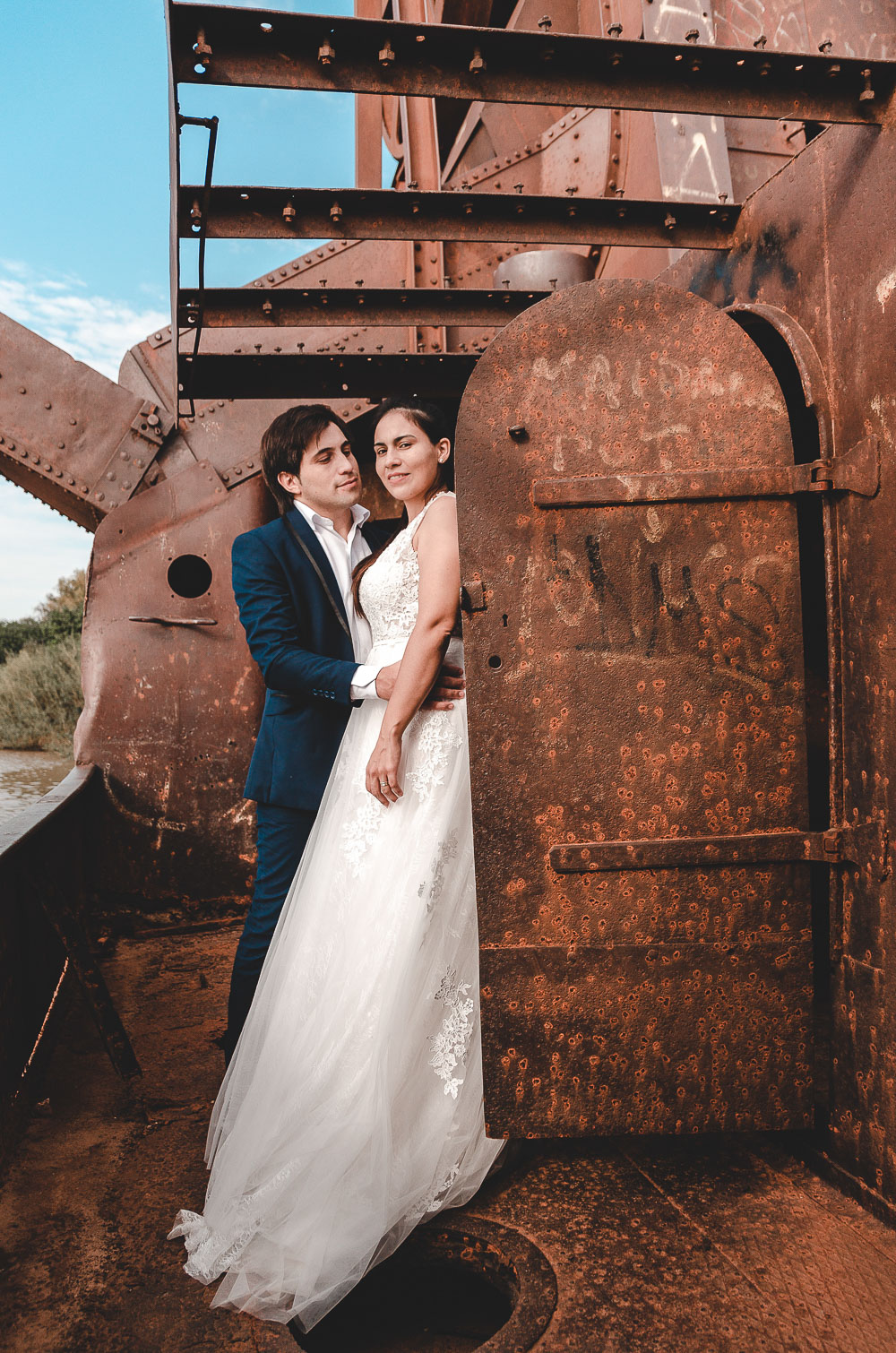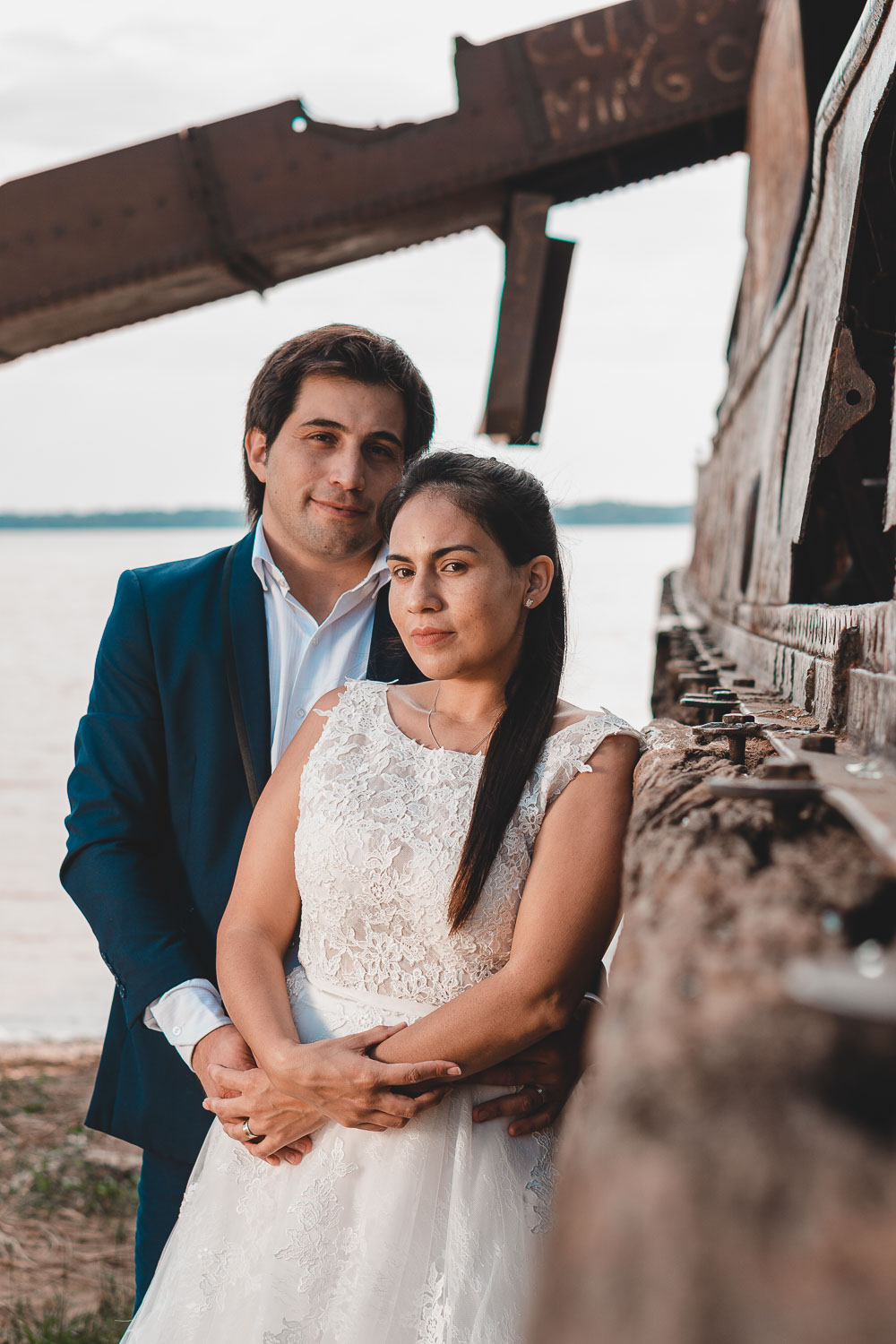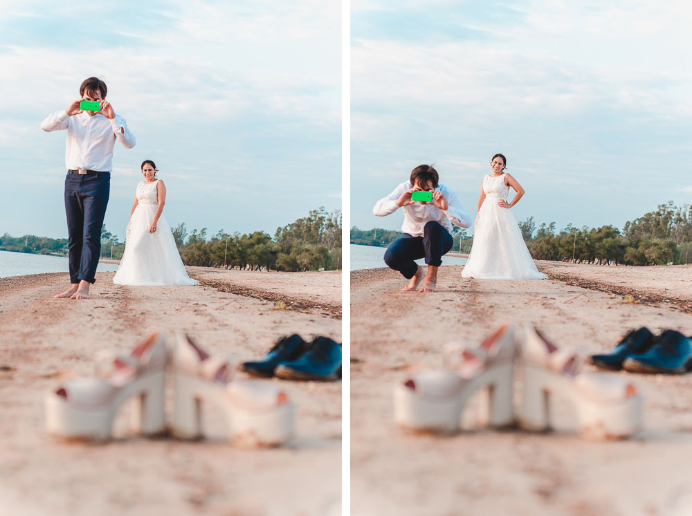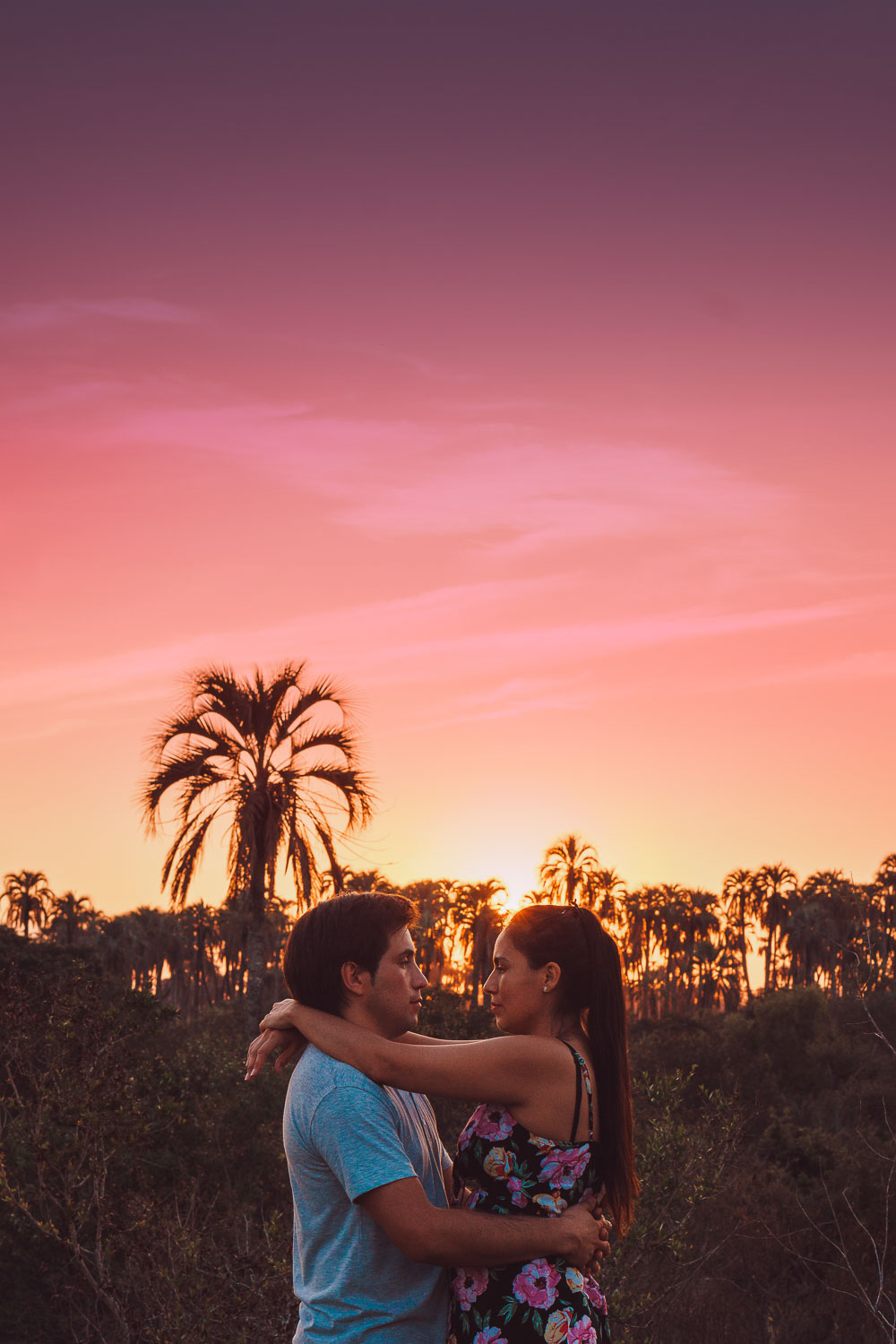 La sesión Pre-boda, el civil, los preparativos, la ceremonia y la fiesta, habían quedado atrás. Victoria y Marcos tenían todo planeado al mínimo detalle, tal cual lo habían soñado. Y la sesión post-boda no sería una sesión de gala nada más, sería una sesión Trash the dress. Cuando el clima parecía no acompañarnos, el amanecer nos encontró en Colón, Entre Ríos, despejando las nubes en el cielo y regalándonos un día de verano en pleno otoño. El Río Uruguay chocaba con la arena, mientras Vicky y Marcos se tiraron de lleno al agua. Las horas pasaron y el atardecer nos sorprendió en el Parque Nacional El Palmar.