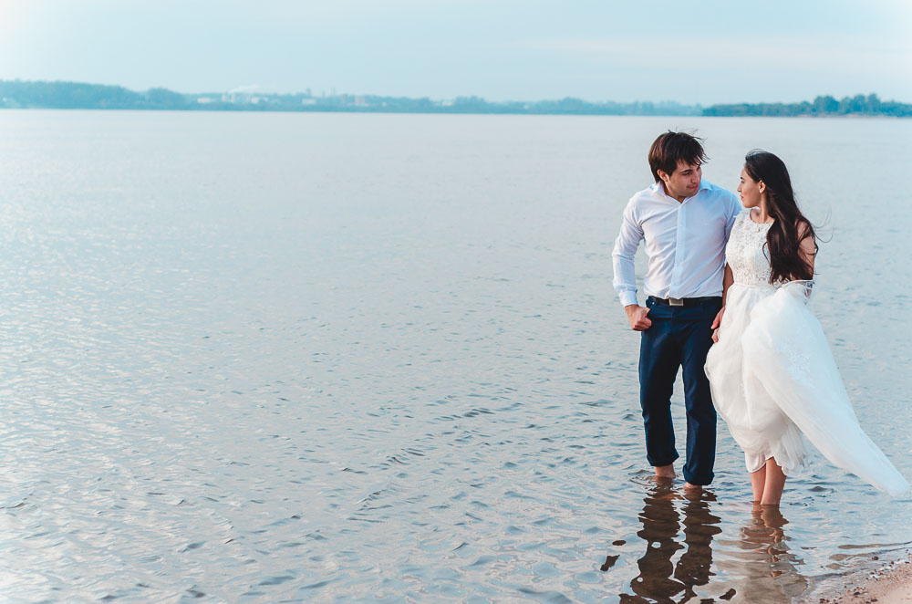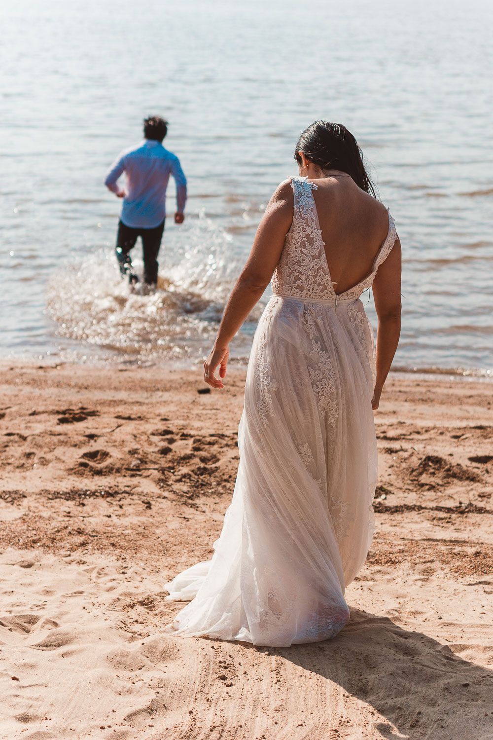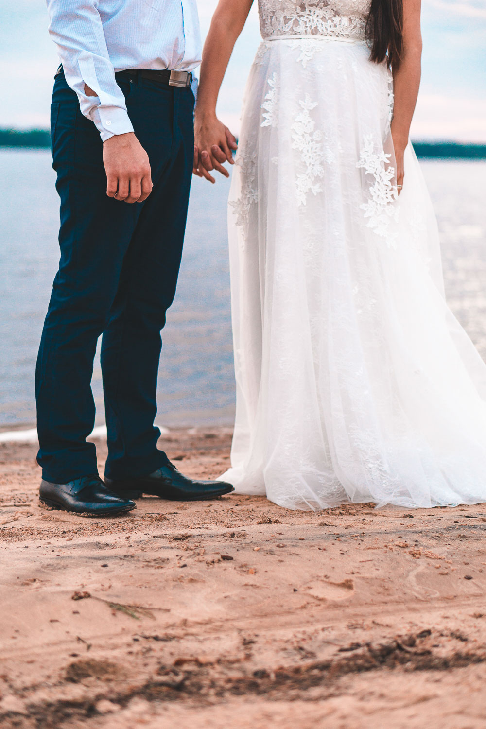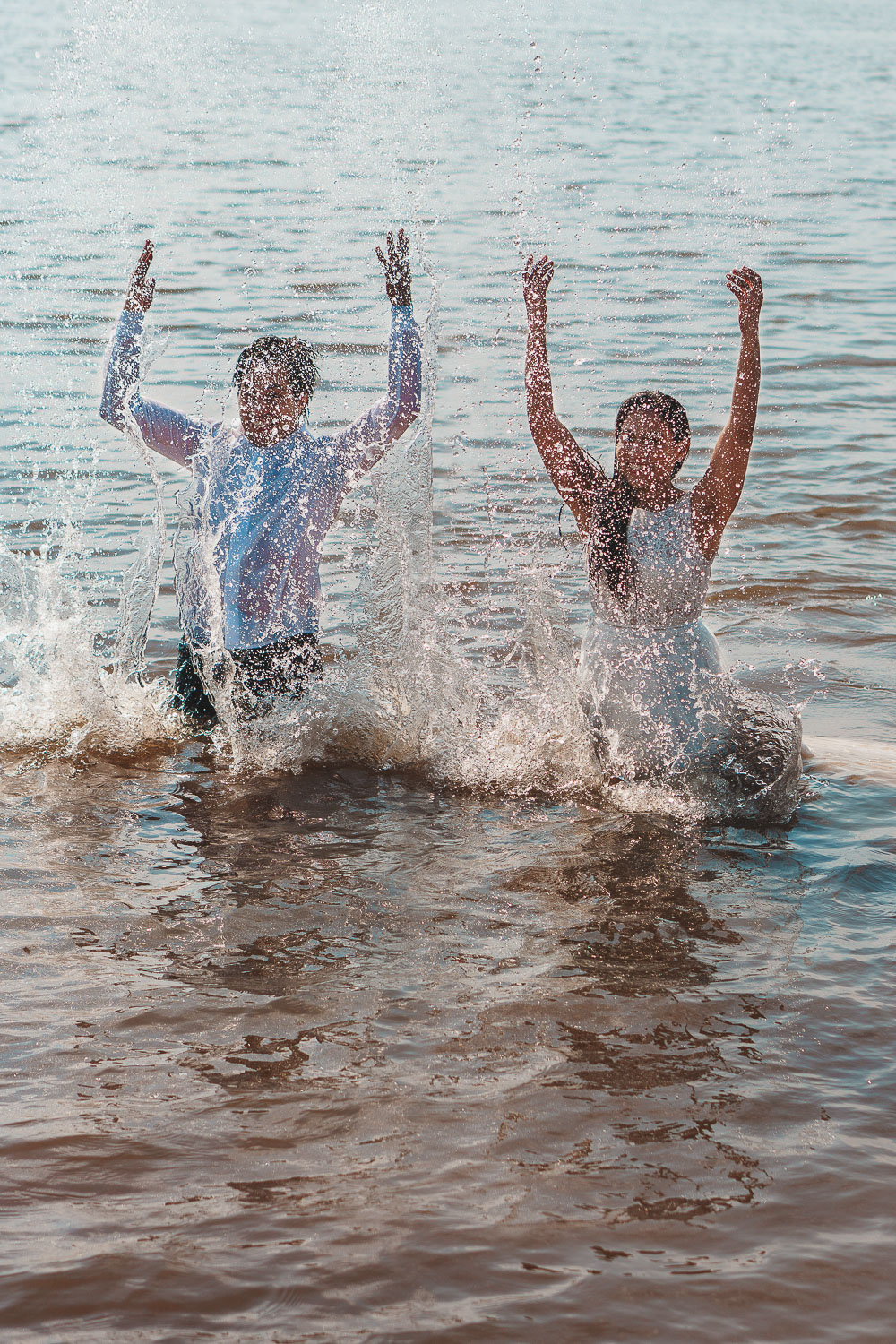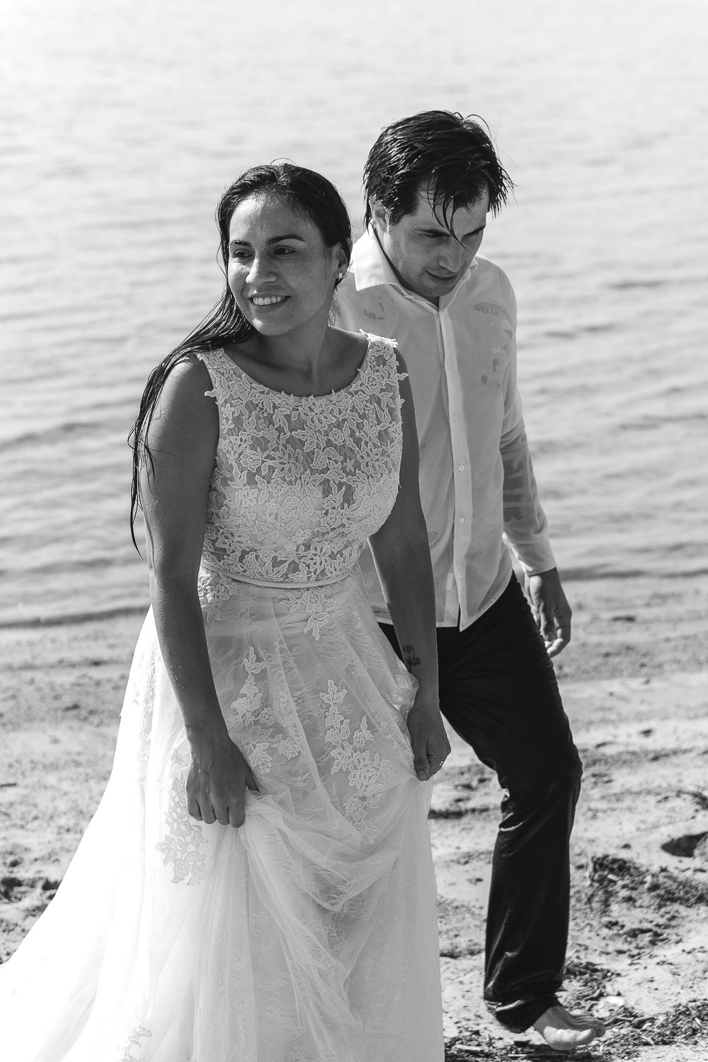La sesión Pre-boda, el civil, los preparativos, la ceremonia y la fiesta, habían quedado atrás. Victoria y Marcos tenían todo planeado al mínimo detalle, tal cual lo habían soñado. Y la sesión post-boda no sería una sesión de gala nada más, sería una sesión Trash the dress. Cuando el clima parecía no acompañarnos, el amanecer nos encontró en Colón, Entre Ríos, despejando las nubes en el cielo y regalándonos un día de verano en pleno otoño. El Río Uruguay chocaba con la arena, mientras Vicky y Marcos se tiraron de lleno al agua. Las horas pasaron y el atardecer nos sorprendió en el Parque Nacional El Palmar.